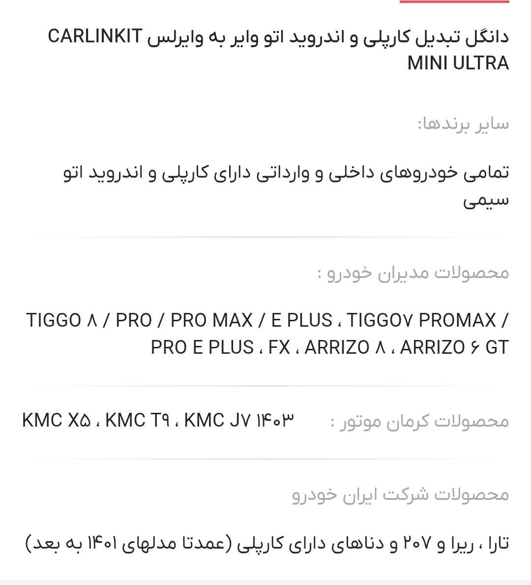 سازگار با دستگاههای iPhone 6 به بالا (iOS 10+) و گوشیهای اندروید (Android 11.0+) که خودرو آنها از نسخه کابلی CarPlay یا Android Auto پشتیبانی میکند.