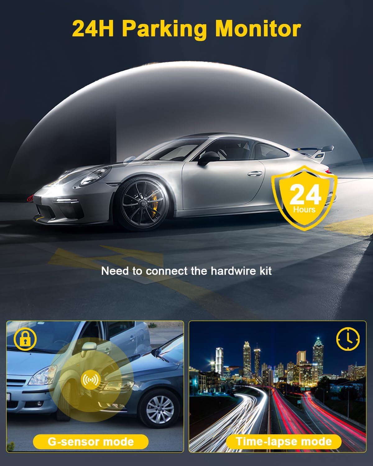 مانیتورینگ 2 ساعته پارکینگ، در هنگام پارکینگ به حالت مانیتورینگ پارکینگ وارد شوید. در این مدت، در صورت برخورد غیرعادی، ضبط کننده به طور خودکار شروع به ضبط فیلم می کند.