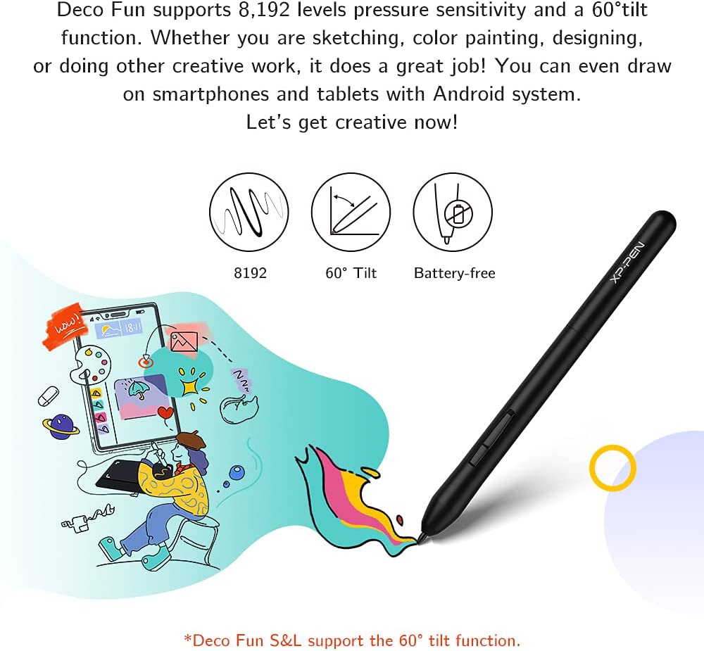 ین سری محصولات با توجه به دقت و حساسیت و قابلیت فنی برای انواع کاربردهای ساده تا کاملا حرفهای مناسب هستند. قلمهای سری Deco Fun از نوع سبک، باریک و بدون باتری هستند و توسط پورت USB-C از طریق کابل به کامپیوتر متصل میشوند. از مزایای شاخص و چشمگیر سری Deco Fun، سازگاری کامل آن با انواع سیستمهایعامل Android, Chrome OS, Linux, Windows, and Mac OS است که امکان اتصال به انواع سیستمها را میسر میکند. این مدل قادر به تشخیص زاویه قلم تا 60 درجه بوده که این قابلیت، امکان ایجاد افکتهای خاص برای مصارف حرفهای در طراحی و تصویرپردازی را فراهم کرده است. طبق اعلام کمپانی سازنده، این سری محصولات با انواع برنامهها از جمله Microsoft Office, Zoom, Skype, Adobe, Photoshop, SAI و بیشتر، سازگاری دارد. گفتنی است این سری محصولات از نوع Plug & Play بوده و به محض اتصال به کامپیوتر، فعال میشوند. در این مدل برای استفاده از قابلیت تشخیص فشار، درایور محصول طی 3 مرحله ساده و کوتاه، قابل نصب است. هر بسته حاوی صفحه (تبلت)، قلم P01، گیره مخصوص تعویض نوک، 10 عدد نوک اضافی و یدکی قلم، دفترچه راهنما و کابل اتصال USB-C است. قلم نوری ایکس پی-پن مدل Deco Fun S CT640 میتواند یک انتخاب مفید، کارآمد و هوشمندانه برای کسانی باشد که در زمینههای ادست و اتود زنی و طراحی فعالیت دارند. این قلم دارای قدرت تشخیص زاویه قلم بوده و این قابلیت به کاربر امکان میدهد تا در نرمافزارهای گرافیکی، افکتهای خاص را تولید کند.